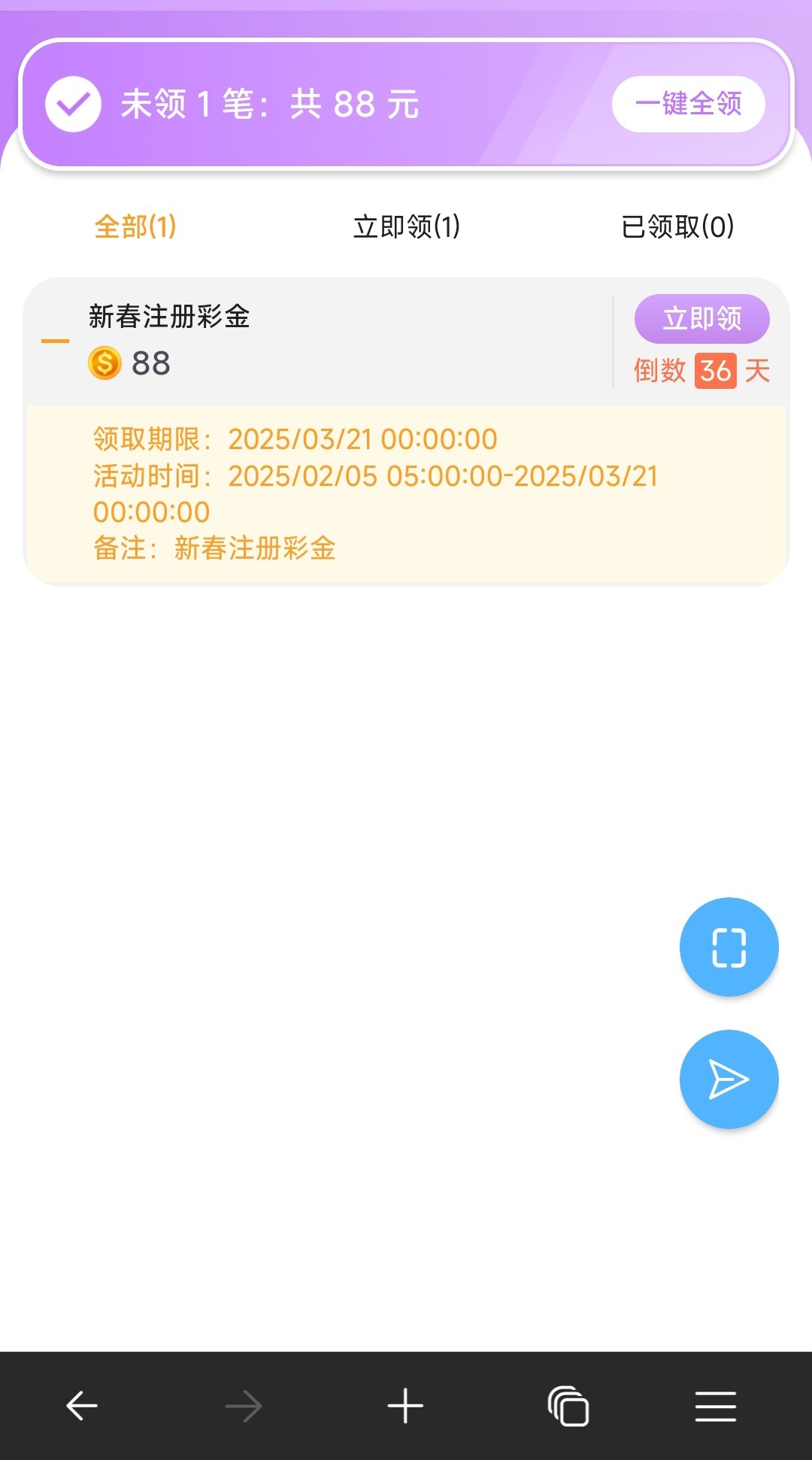 具体是什么彩金我也不知道 我不记得我有注册过昨天给我发短信让我看微信 然后微信登录上就说有88彩金我就进去看到了 但是我记得没注册过很奇怪 我试了几次密码对了显示账号被锁定了要找客服让他给你解冻 好像是新春注册彩金 自己尽快去试吧人多了可能也就没有了 我感觉应该是老用户或者是前几天注册的才有 现在注册没用 没有勿喷 出款我测了110 5分钟到账54108.com