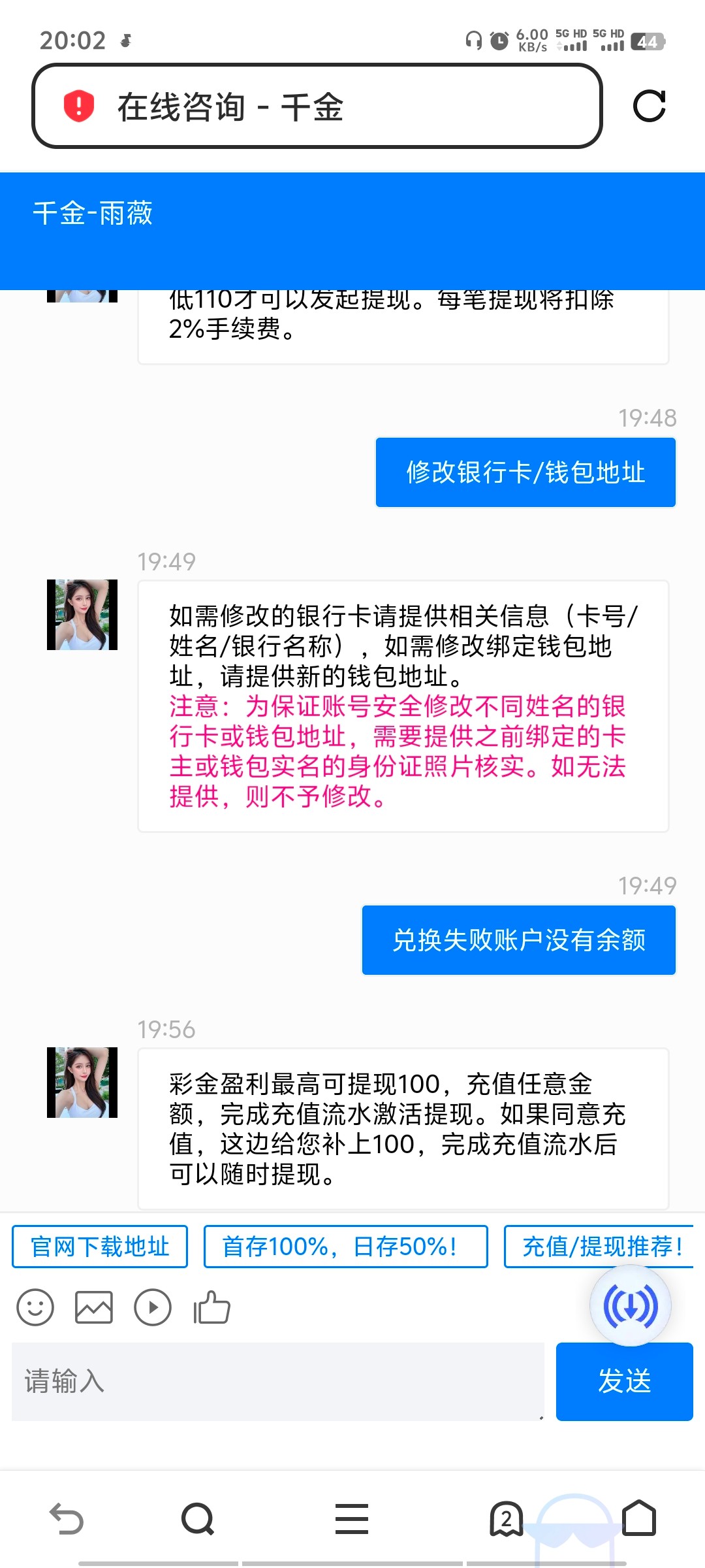昨天打到128出款107直接撤销取款扣光了。早上存了100进去,平台退了100回来。他家流水很奇葩,只算pg是百分之百的流水,你如果打其他游戏只能算百分之50的流水,打了200多的流水勉强算够了100的流水,出款要留在平台最低7元,扣了7元还要扣手续费,出款一百扣2元,一共出了270元需要保留在平台上7元,手续费扣6元,只到账253元,也是够奇葩的公司了,大家自己考虑玩不玩。