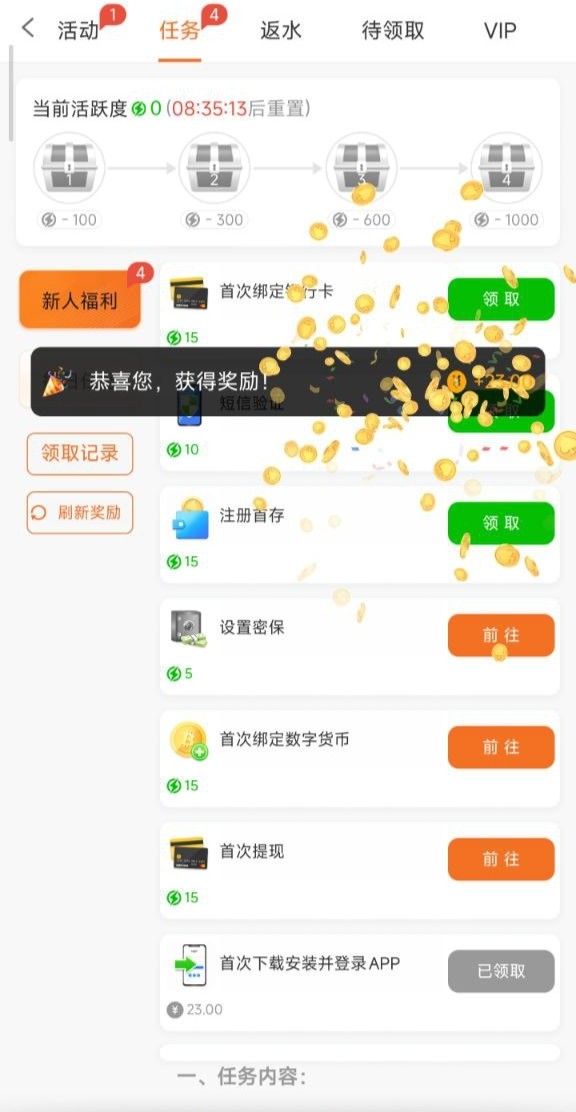 老用户网页登录下面有个任务里面有个下载App领取23彩金,下载领取即可,具体自测