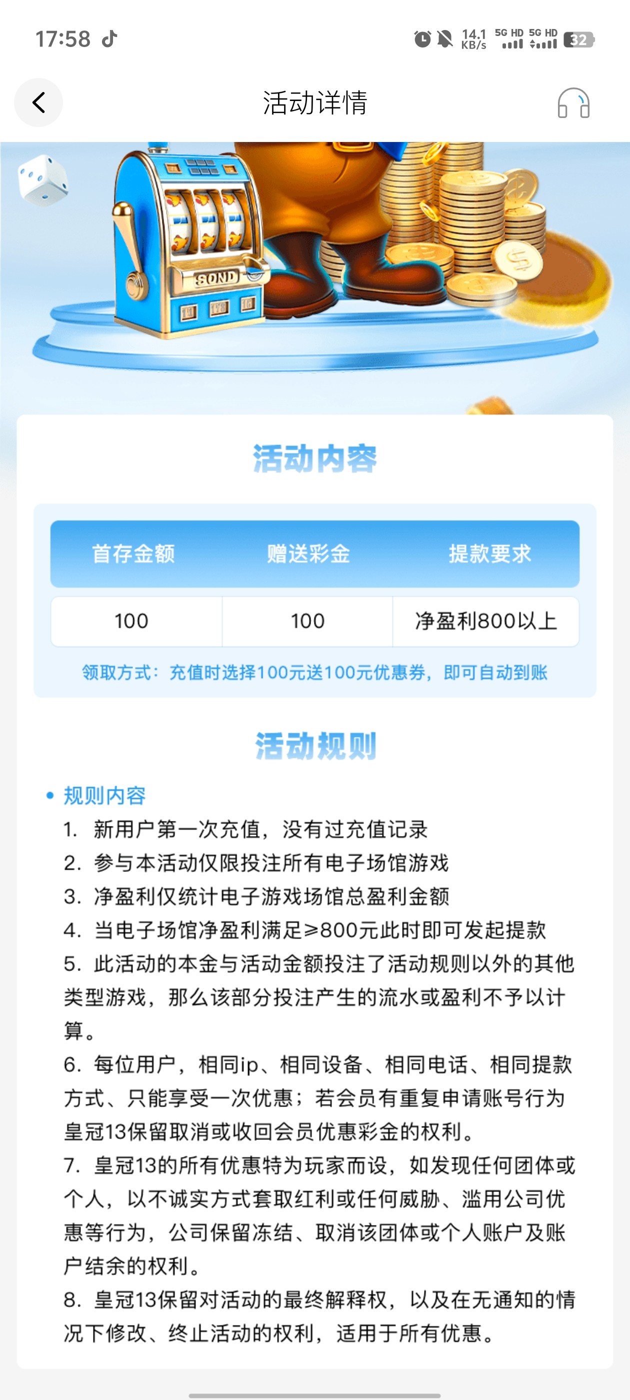 皇冠首存100+100彩金
