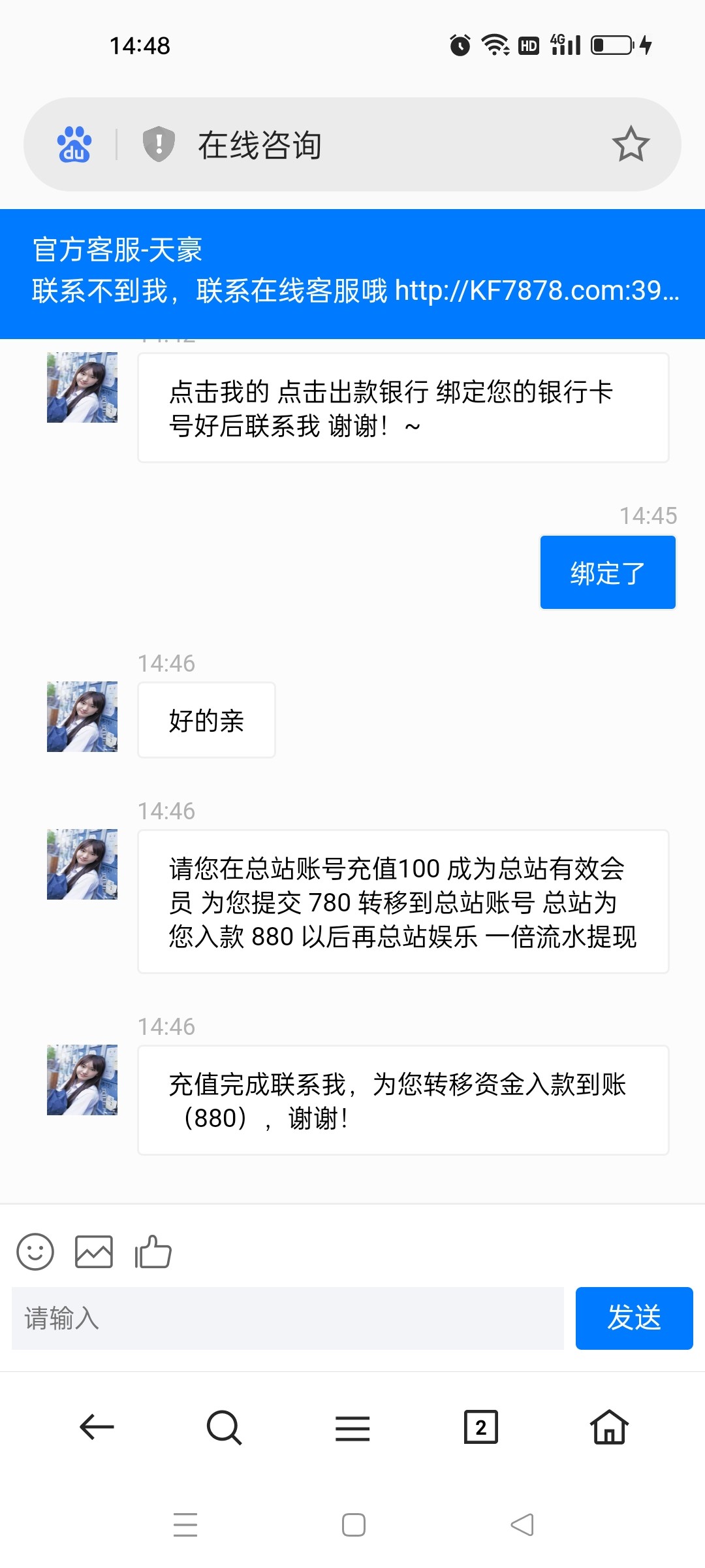 假的 100给你10块钱说分批给 就是骗你充值