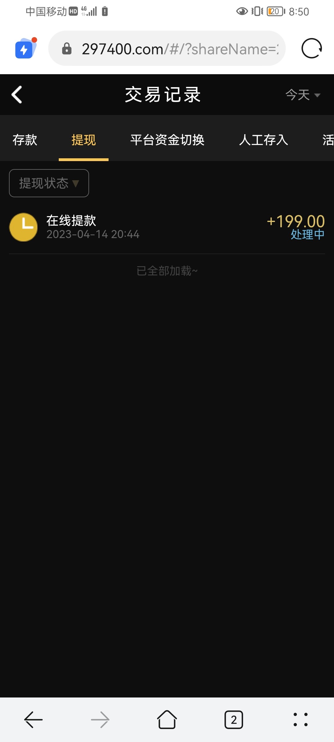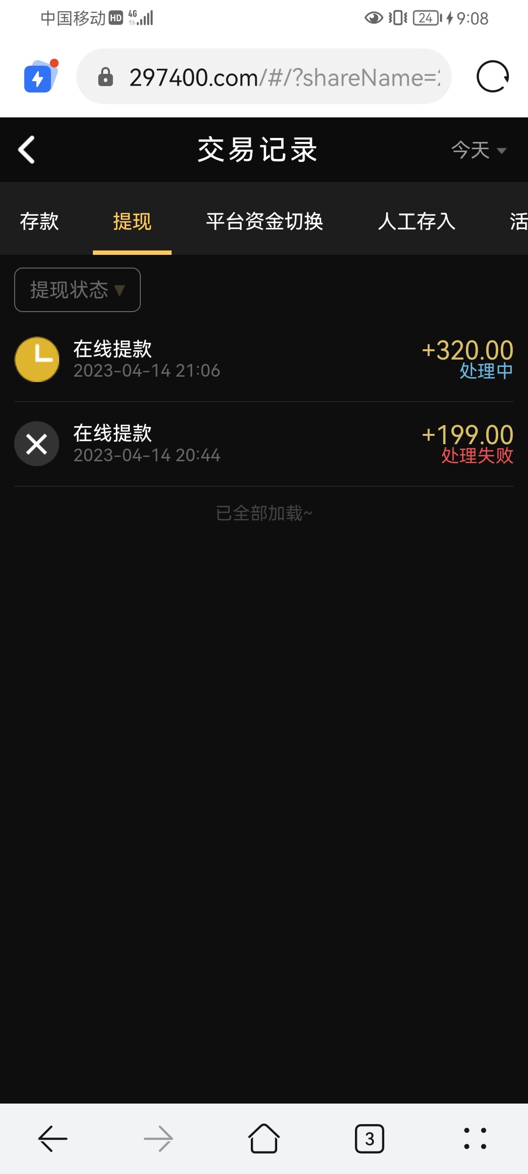 感觉半黑,我后面流水打到240,他前面那个提现就一直处理中,我心一横直接输完了他提现立马到账了