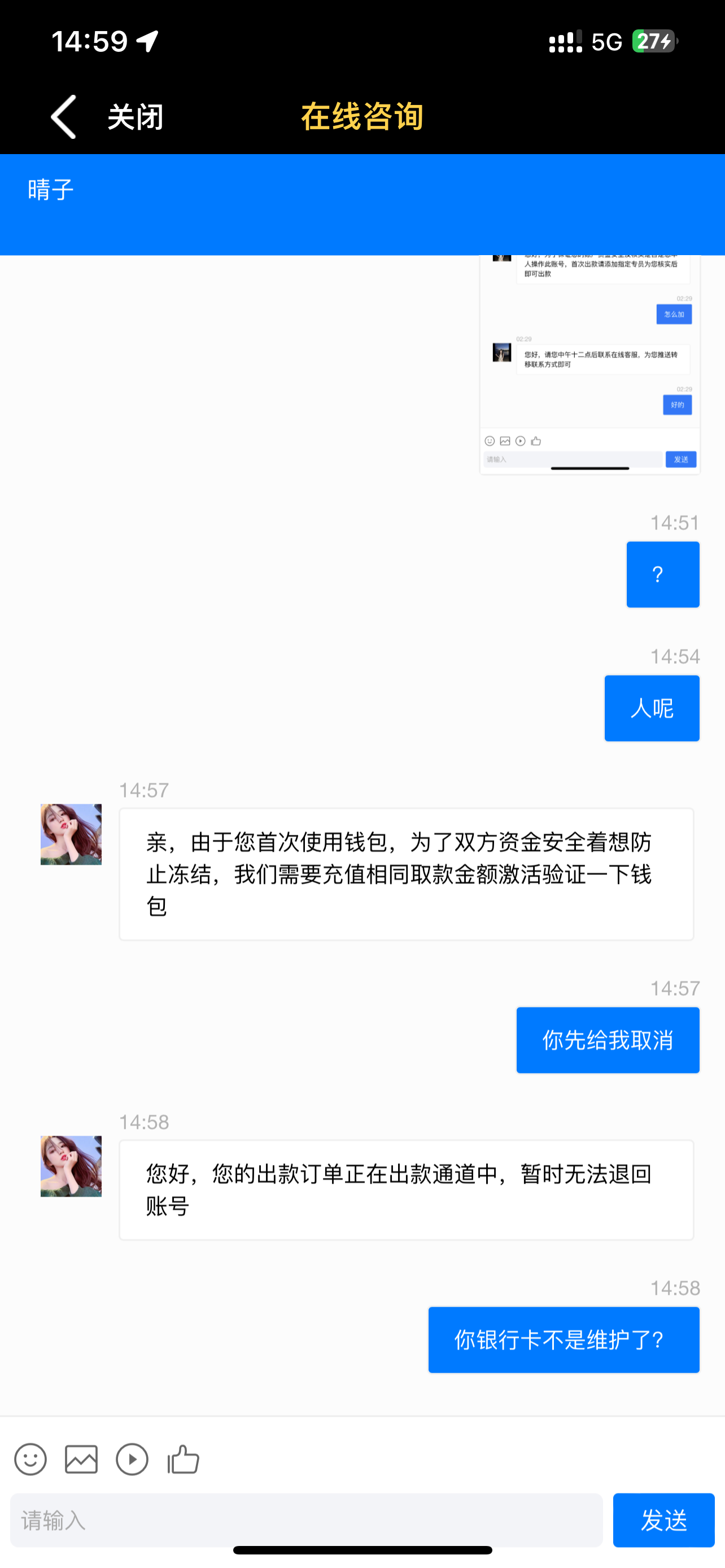 本来一直知道是黑台,后边时间久了忘记了,上了首存100+68,打到500多提现退回,骗我说要充值一笔验证钱包,我又充了1 00,然后改了我钱包地址说填写错误,又要又要我充值300,后边没充值,账号冻结