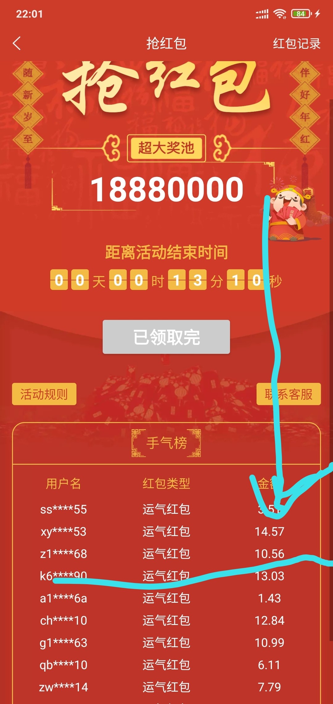 我之前抢了一次10.56去申请1000倍彩金,说我活跃度不足,漂亮
