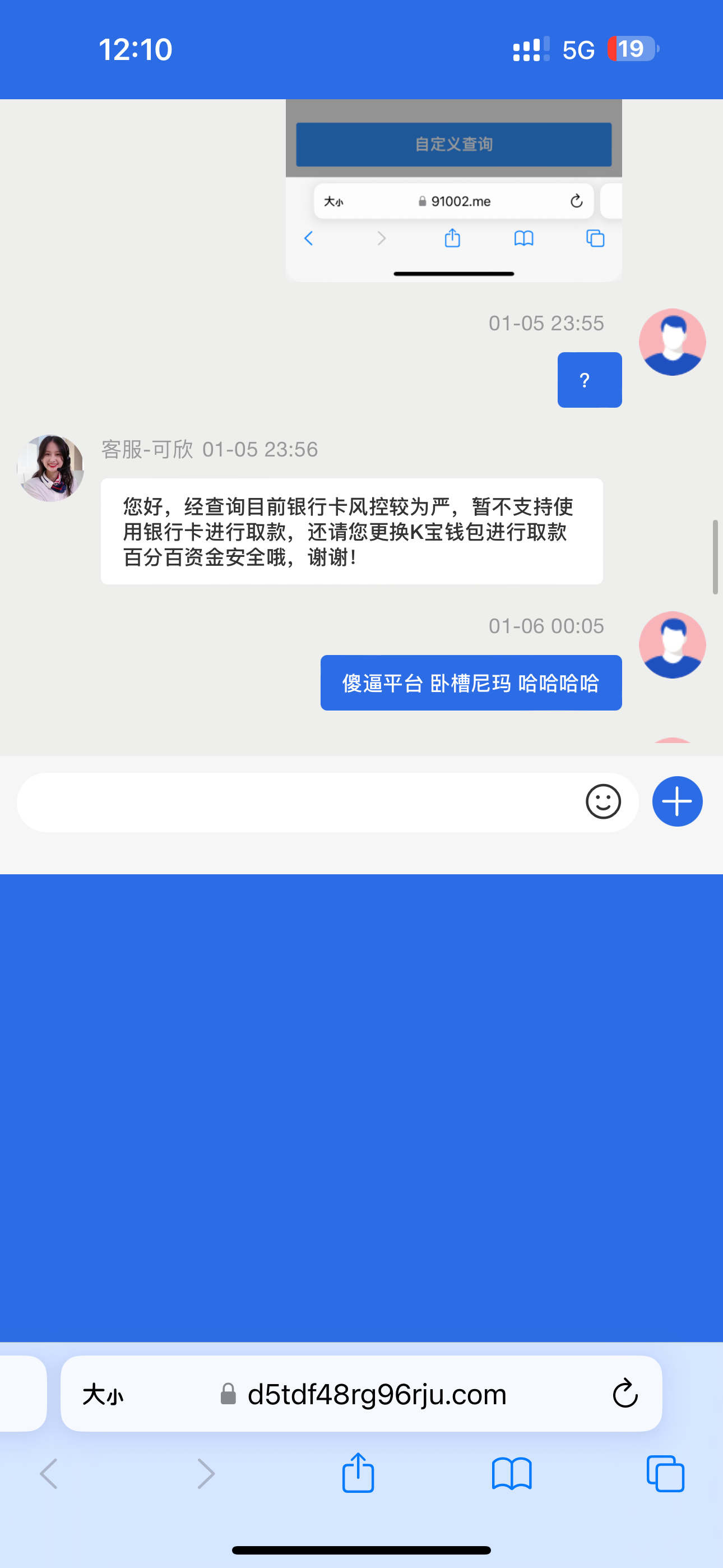 不说什么了 开始白嫖100不出 要我充值 充值100打完还是不给出 一直推这推那里 k宝说我地址错误 银行卡提现说银行卡通道不行要我提k宝 真尼玛牛逼