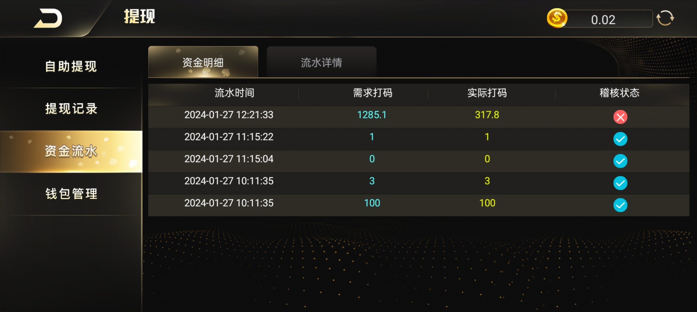 用钱包充的,没申请一分钱彩金,一直玩的真人。提现200不到账,问客服说注单异常,让重新打1200多流水,只能棋牌,纯黑台一个