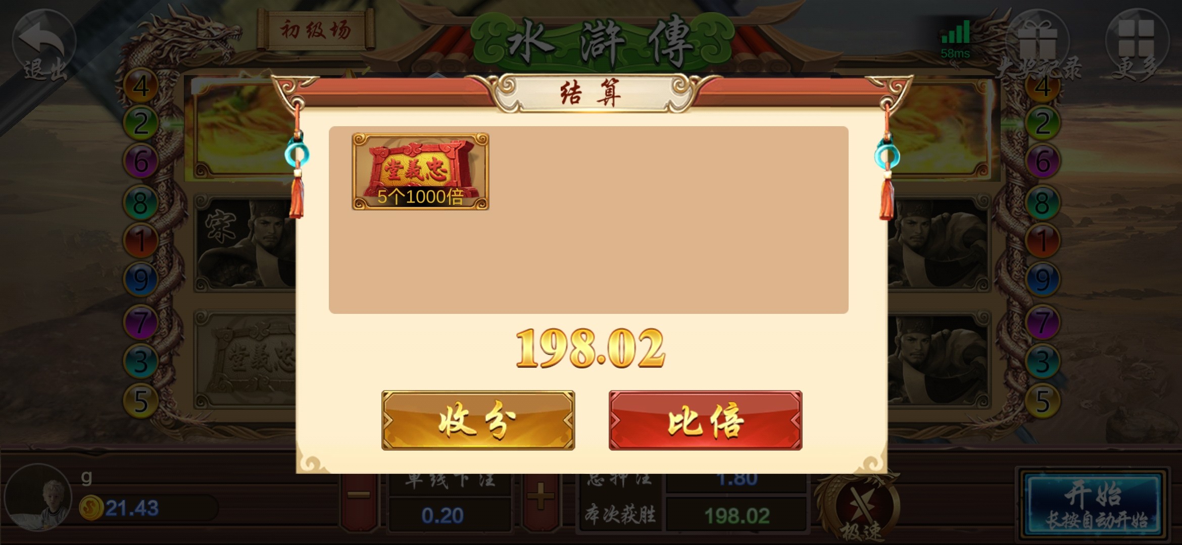 打出来了不知道能不能到,进去玩老虎机点俩下就一百多了