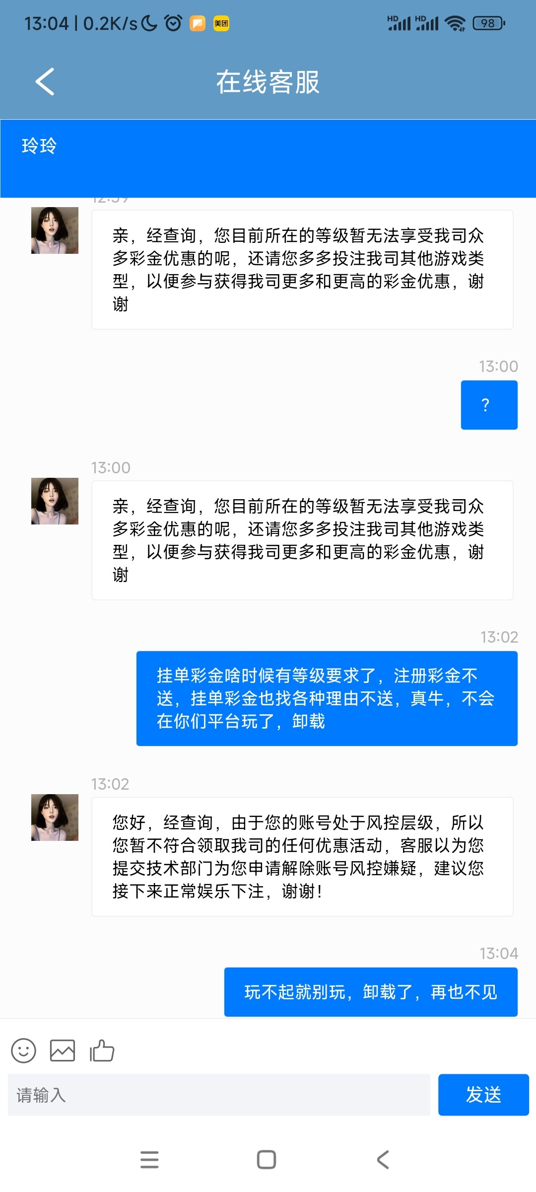 垃圾台,注册彩金不送,我自己充值玩挂单出款了,挂单彩金也找各种理由不送,一下是等级不满足,一下又说违规,还学人家76c,云顶,四亿,这些台我多号挂单彩金都送