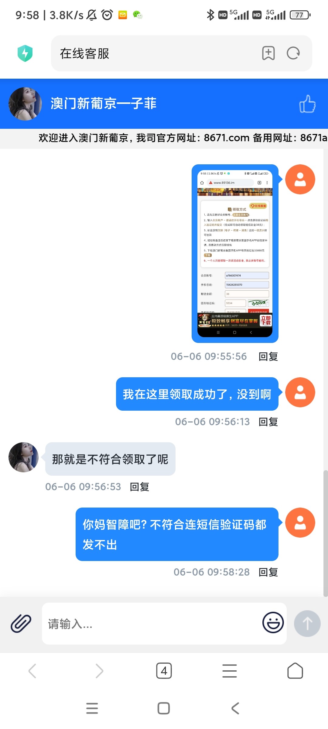 特邀碰瓷,先看看有没有下方短信有的下方链接自助申请38彩金,没有可以去碰瓷试试,或者等短信吧,具体自测切记勿充值。