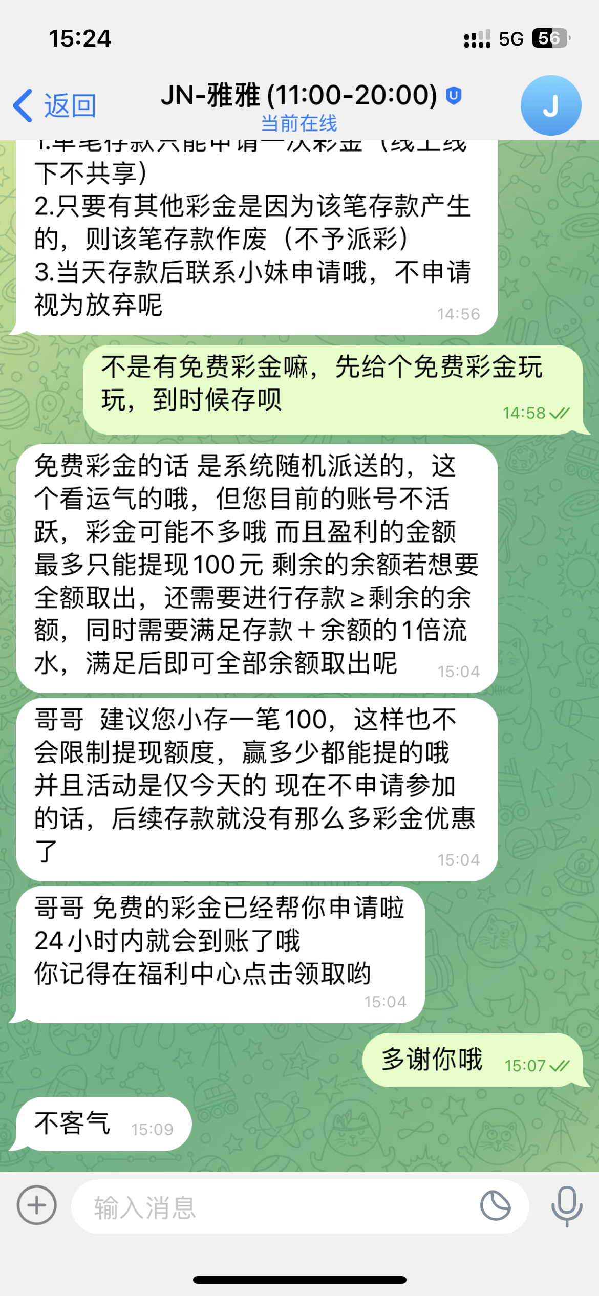 充值过的去,我就以前存款过一次,今天没事做问客服说好运彩金,然后客服说帮我申请,等了两分钟就让我➕专员,很多人说鸭脖系黑,我觉得看脸吧,怕黑的无视此帖就行,jnty.com
