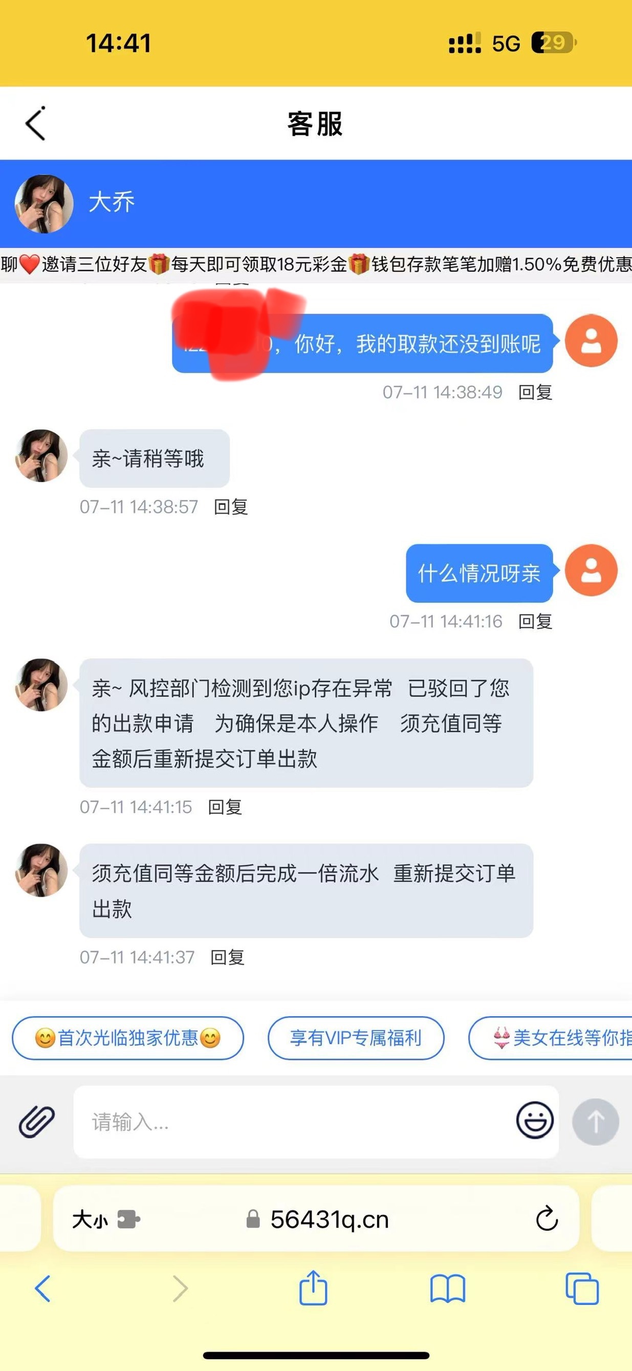 昨晚我也打的特邀首存100上1000提款说我系统检测流水不足我都干了6000多流水了然后又说我ip异常让我继续打码后面又玩了一个多小时才提出来幸好是提出来了