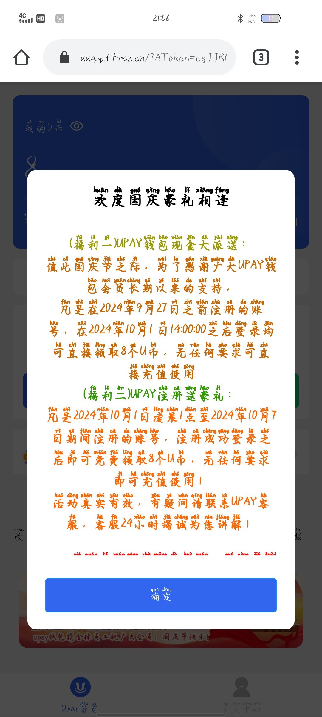 神州飞扬,壮丽山河,锣鼓敲响,歌声嘹亮,举杯共饮,欢声笑语,阖家欢乐,国富民强。祝你国庆节快乐https://m.819828.com:8889/这个链接点进去注册点充值,然后选vip钱包,点upay有个进入钱包,就可以进去了,没有官方链接