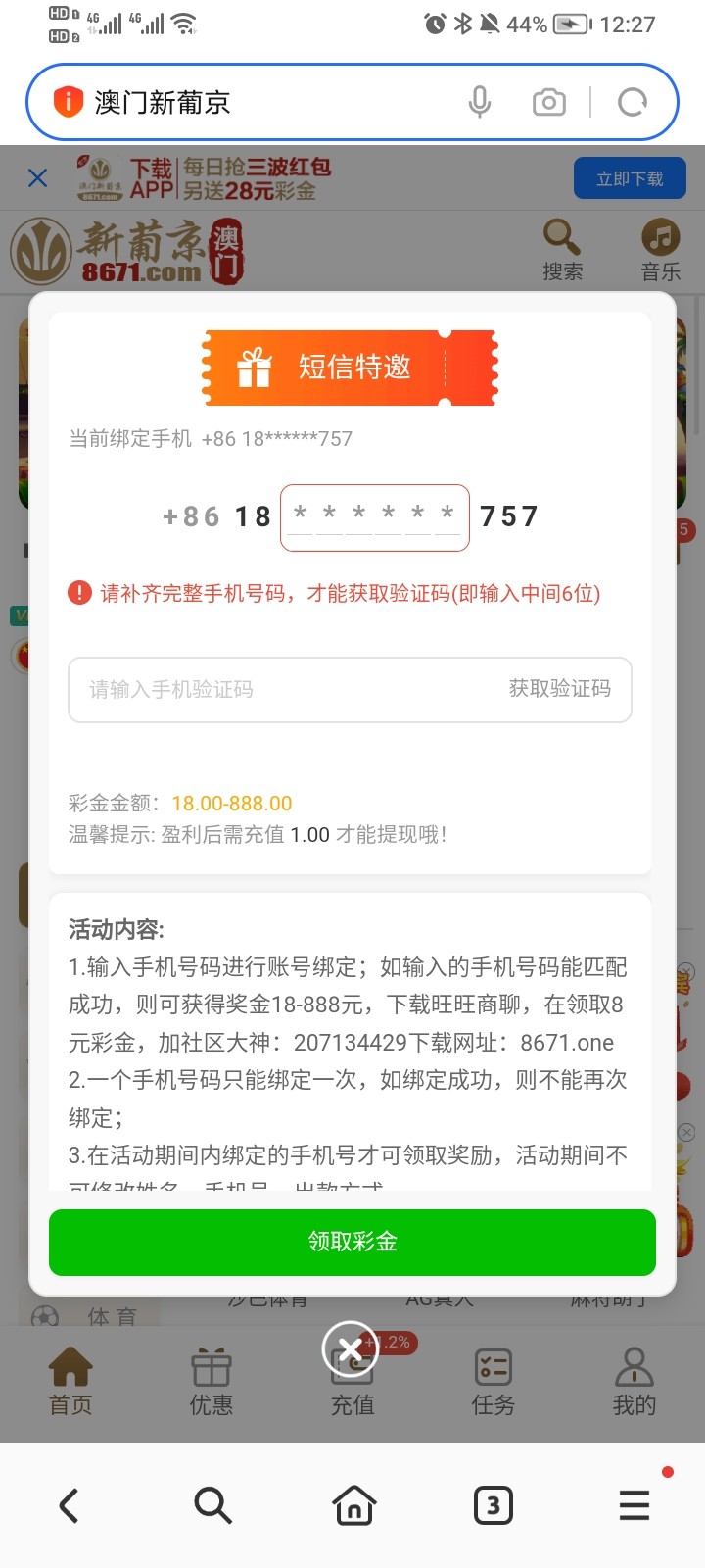 优惠活动里自助申请,是特邀的话领28彩金好像还可以再下旺旺领8彩金,赢钱后要再充值一块钱才能提现,去看看,链接https://xi09pj.8671e.one:27736/