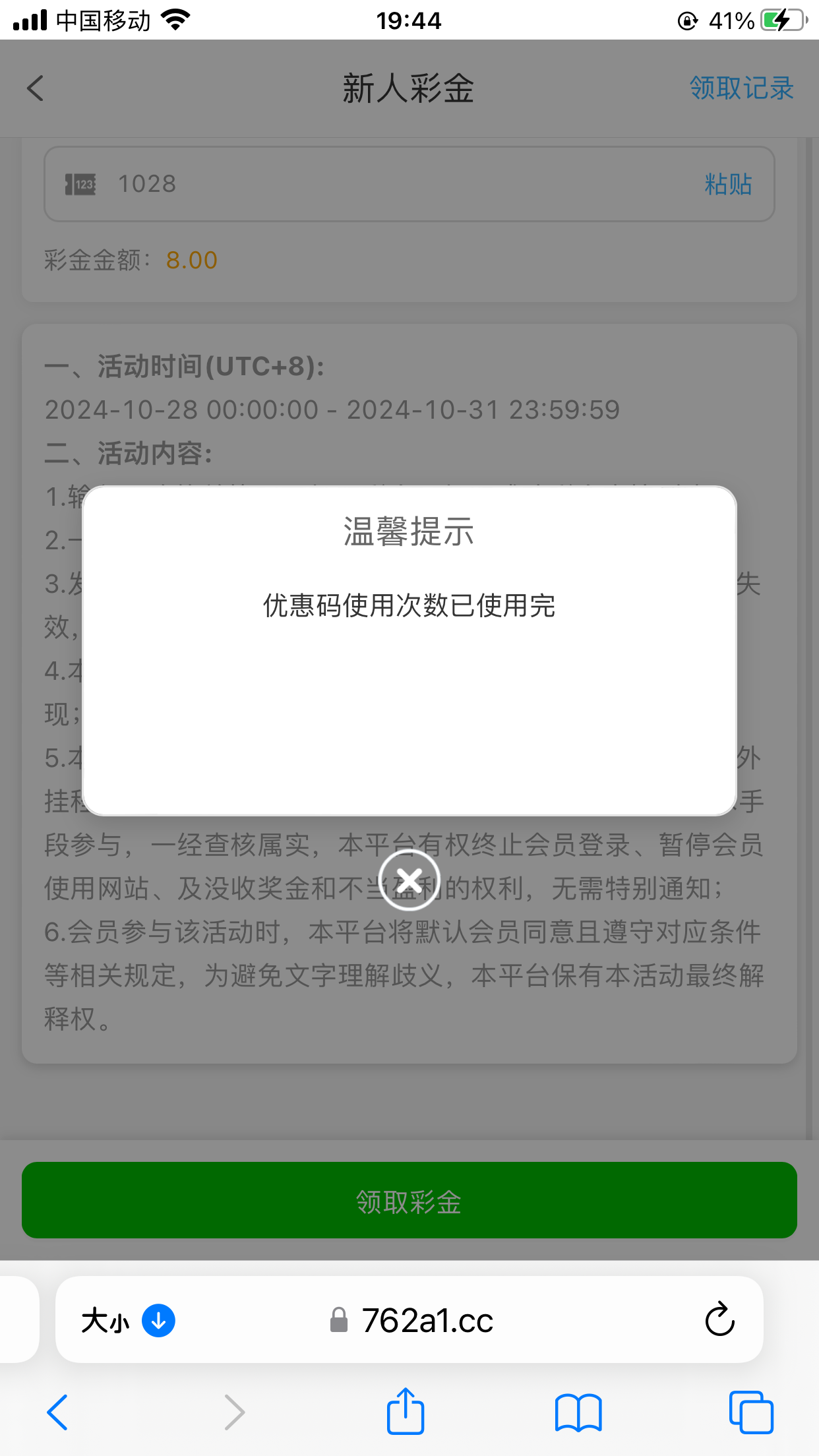 活动中心填写专属邀请码【1028】能自助领8块,满50就能出款,一个手机号能领一次!链接https://762a1.cc/?cid=350993&type=2&currency=CNY