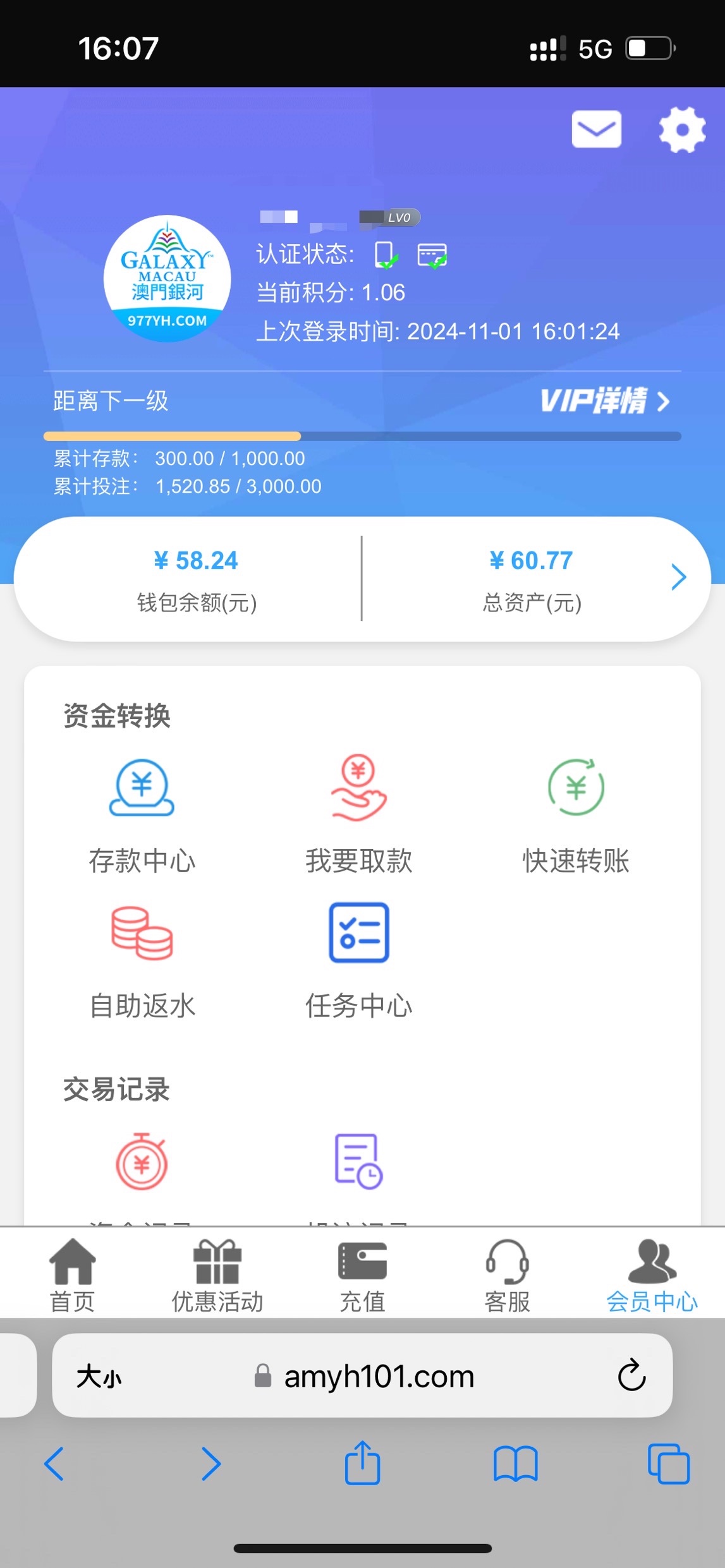 有未接电话的可以上号看一下,网址977yh.com,注册没到10天,充了300,送了4次彩金