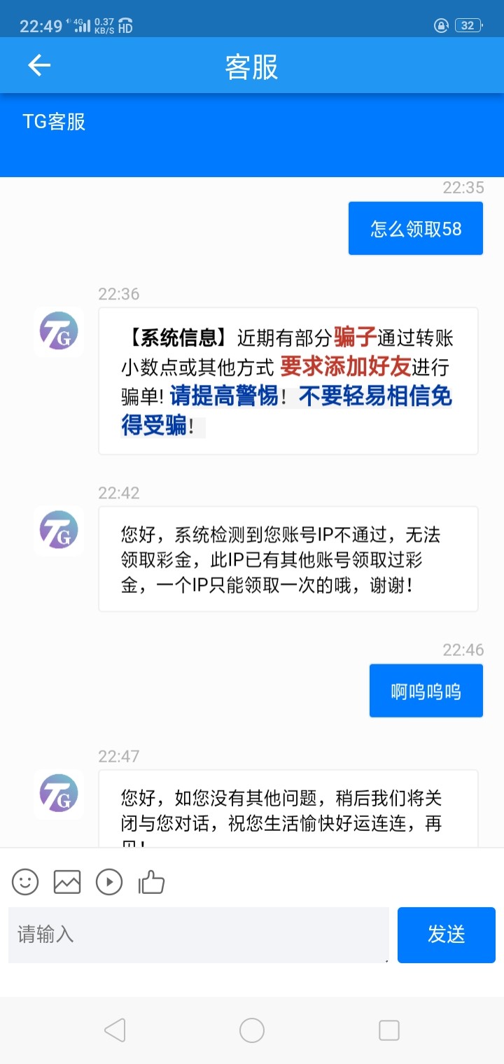 您好,系统检测到您账号多账号IP不通过彩金,此IP已有其他账号领取过彩金,一个IP只能领取一次的哦,谢谢!