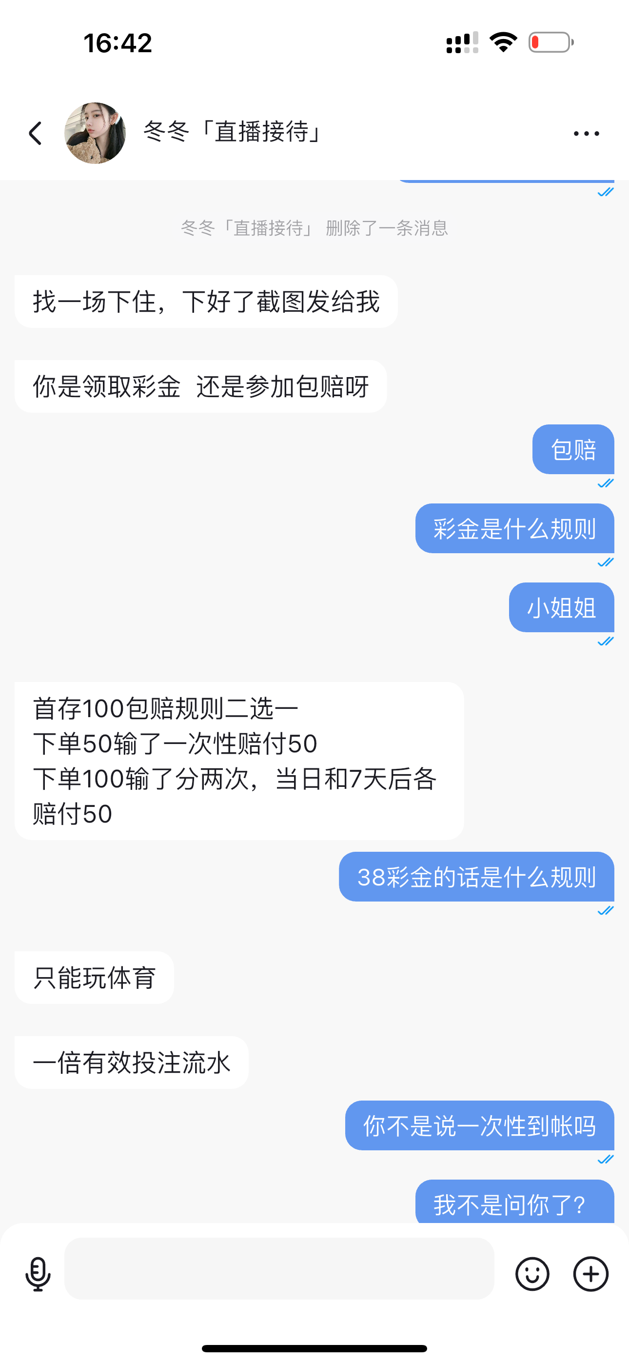 兄弟,希望下次说清楚一点,包赔100,你下100的话,他当天只陪你50,剩下的50还要七天以后才陪