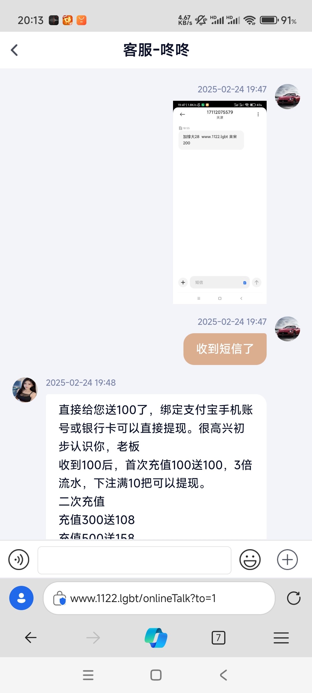 永胜28收到短信送100
