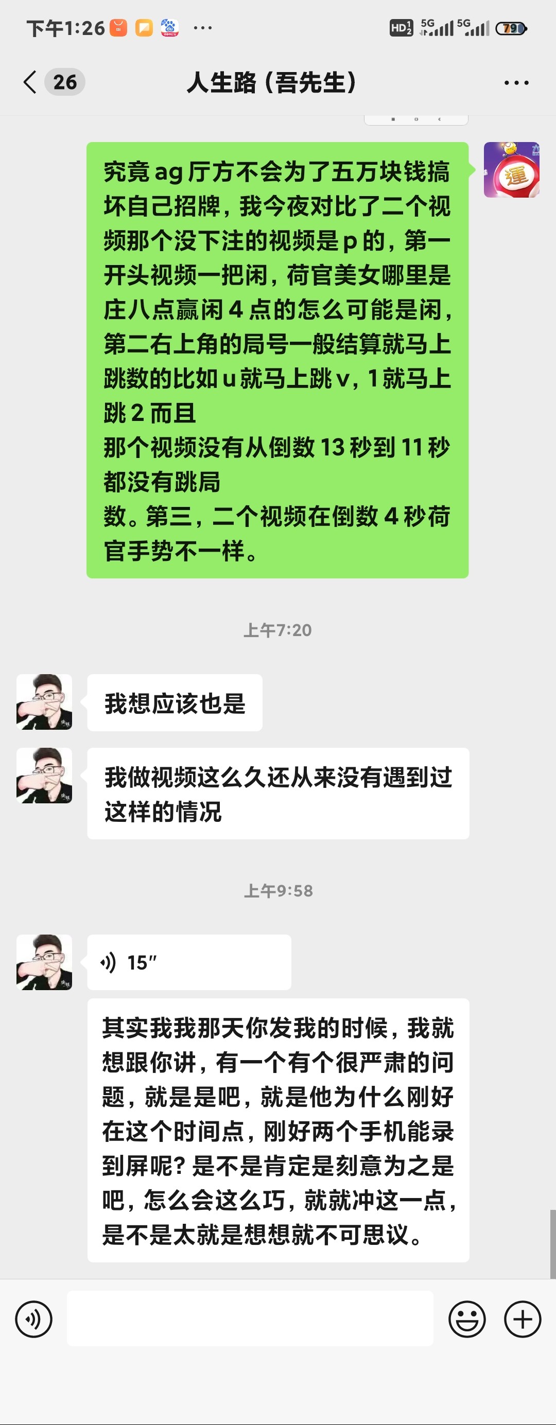 你看论坛那个老哥发五万ag一把那个,他在其他论坛也发这个贴,他在一个月前都发ag假,为什么还在1十几天前下50000一把ag一边录屏一边下注录一个没在意还录二个,真正下那么大的还有心思录屏幕上去一把闲路珠马上哈五万闲。我没有说ag不假。当我看到他二个视频我还去直营台差那个局号开奖结果,想想一直哈ag看他的视频心里都累,究竟玩了七八年ag有时候连杀十几把,所以一直在找证据去其他论坛找老哥有没有在那个时段下注那局号的。所以一直要找出那局牌的证据到底是不是ag厅方看到这二个视频修改结果。我之前也玩来五万一把。想着当初ag是不是那样点杀我。