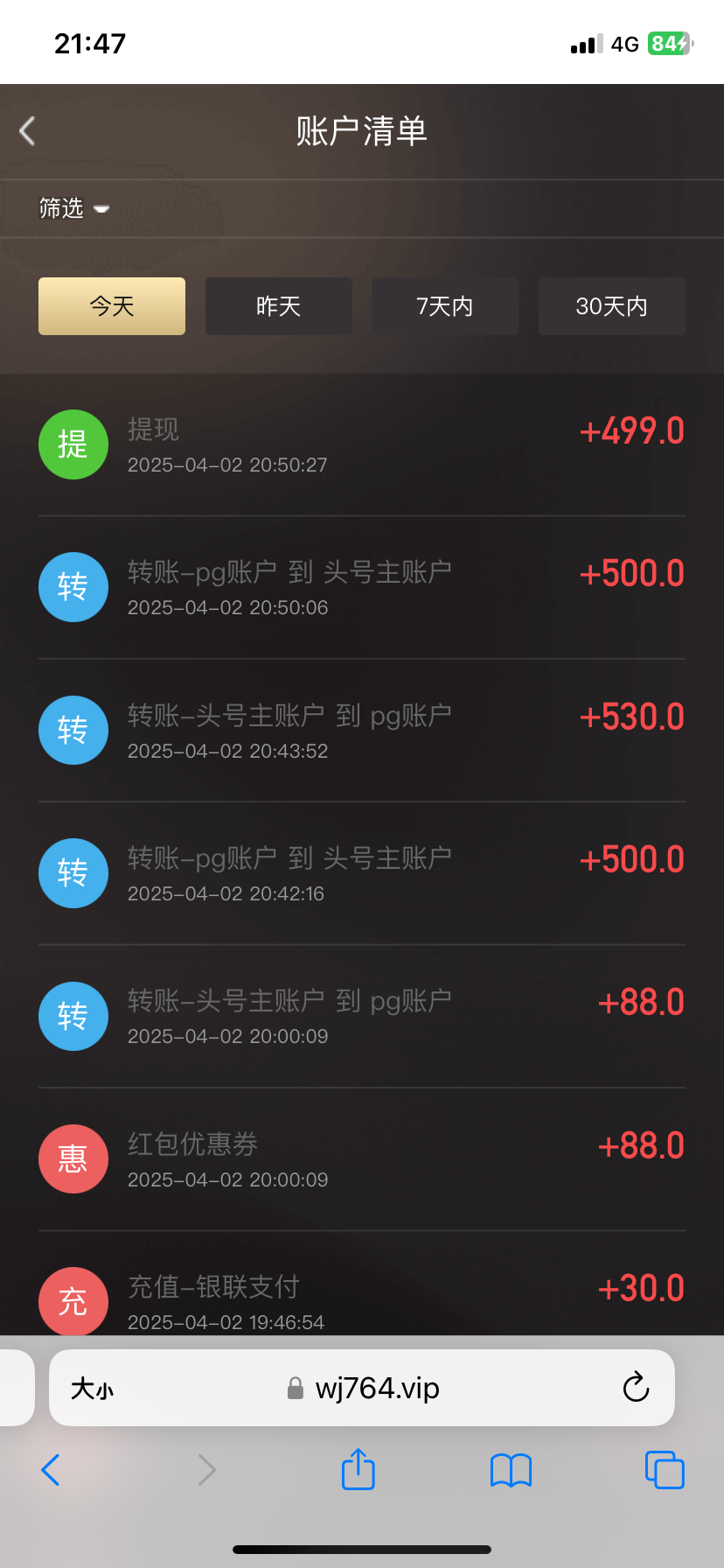 我没有,上次88优惠1充值,提了500,后面就没玩过了。现在也不敢玩。半黑台