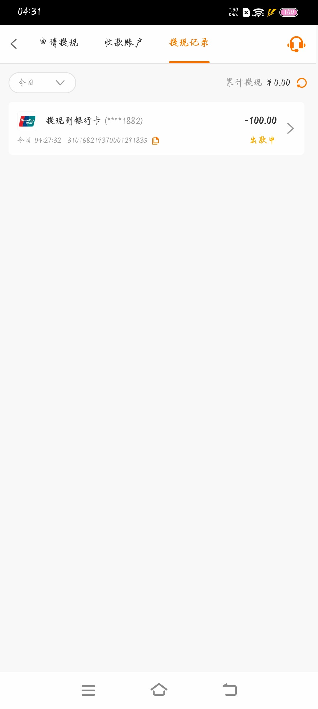 第一个客服说账号异常,等待审核,一直审核,后来换了个客服,五分钟审核完成,提一百到账了