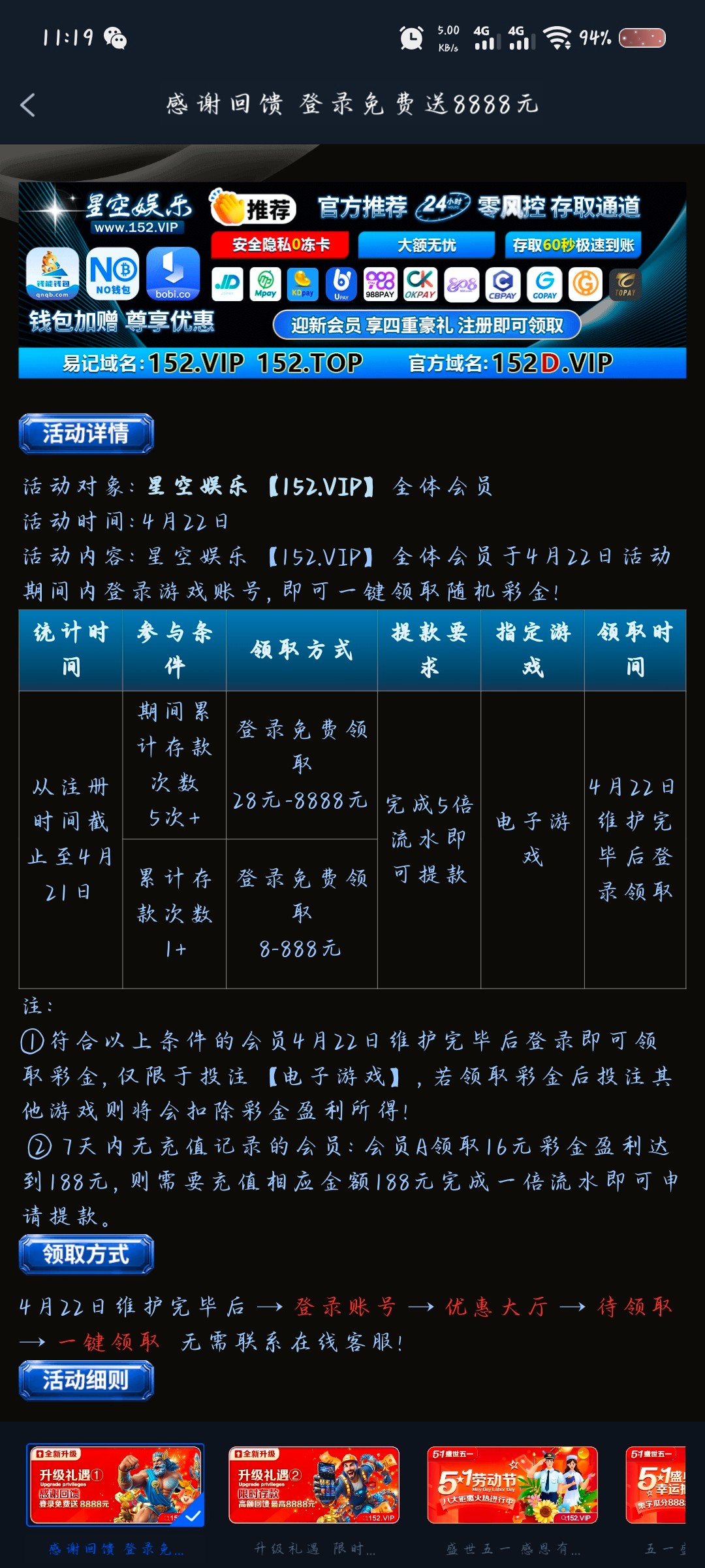 星空回馈28,最低8要22号过后回馈21号之前注册的都有,没弄得抓紧后面领彩金,