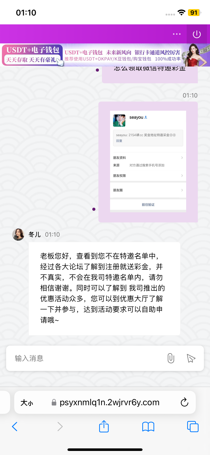 老板您好,查看到您不在特邀名单中,经过各大论坛了解到注册就送彩金,并不真实,不会在我司特邀名单内,请勿相信谢谢。同时可以了解到 我司推出的优惠活动众多,您可以到优惠大厅了解一下并参与,达到活动要求可以自助申请哦~