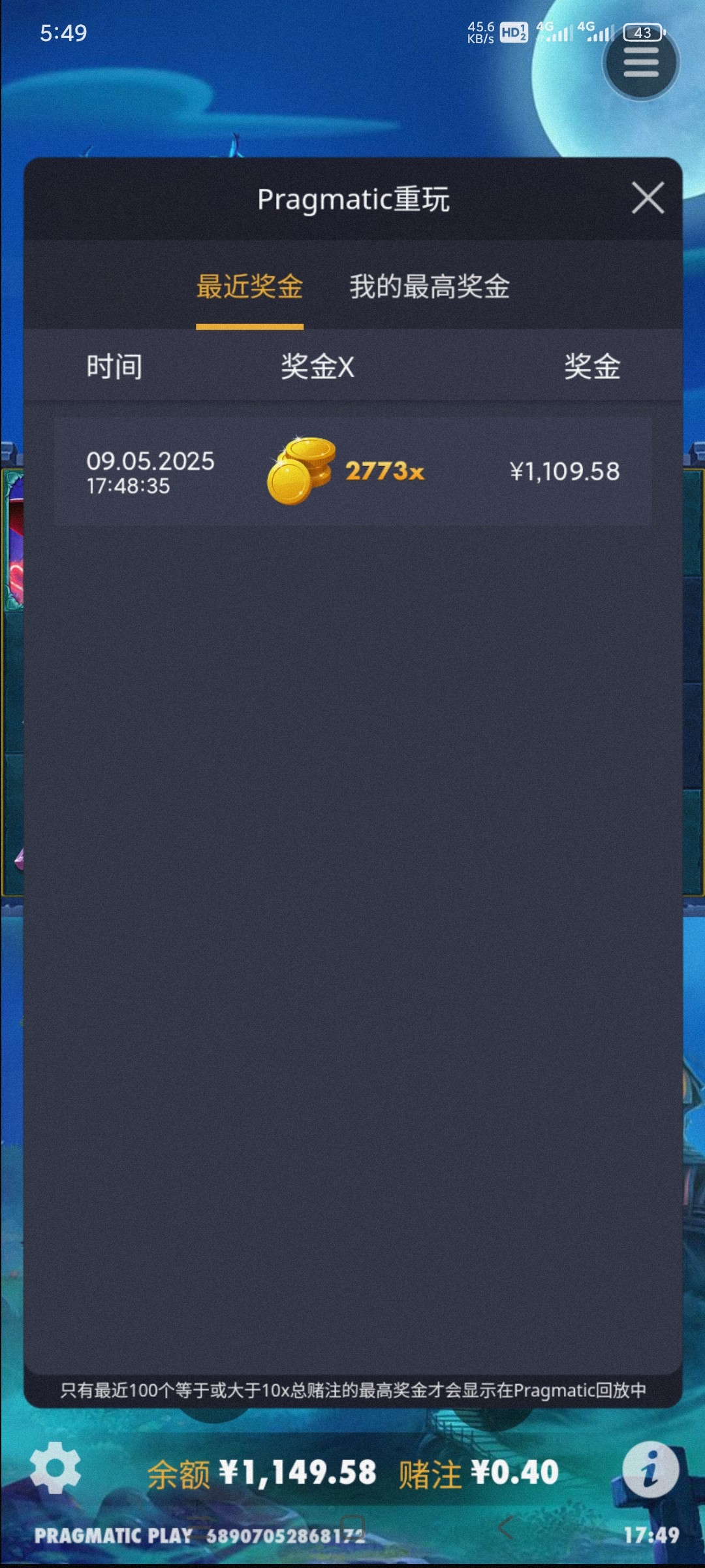 今天九游狗代给我送了100彩金,去pp买了一手就爆了,以为出不了想去pg藏分,结果他妈的一千进去杀到300都没个免费最后磨了一会提了500,现在的pg是真玩不了了啊老哥们,我这个月全是pp的高倍,pg他妈死妈的跟畜牲一样,玩不了一点