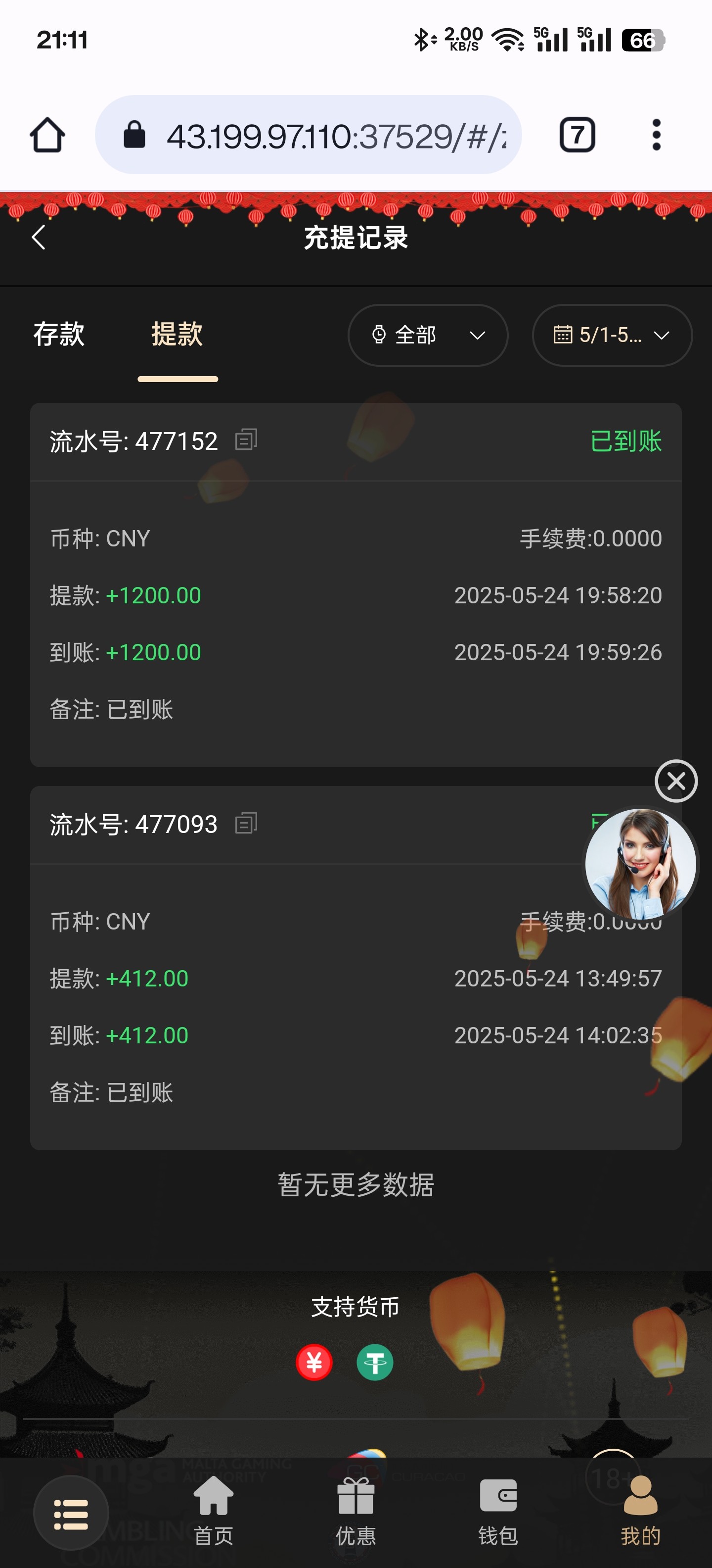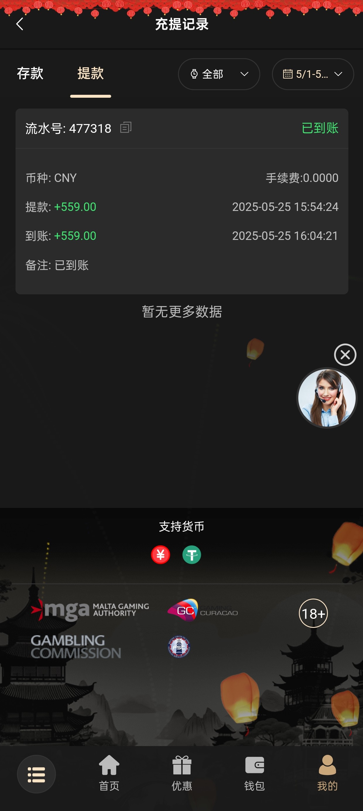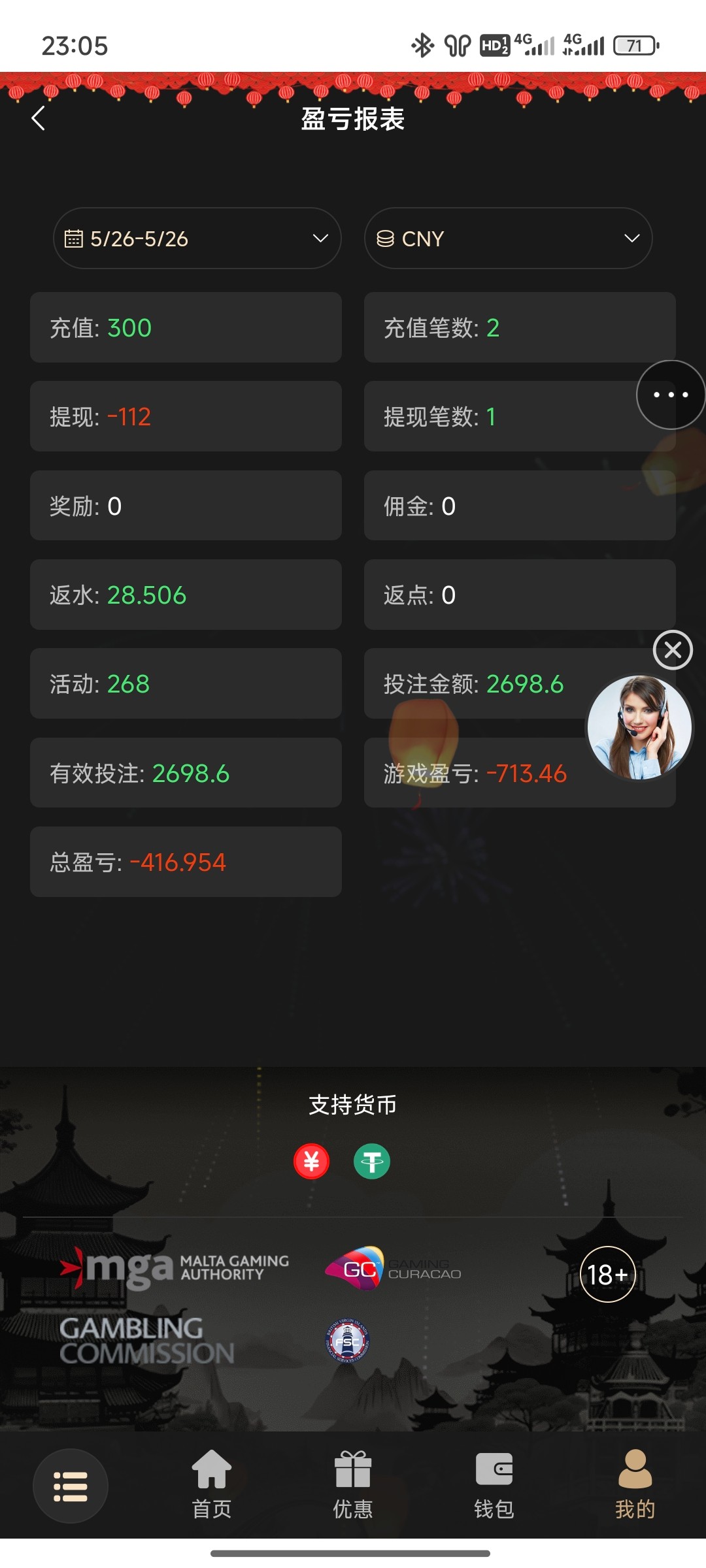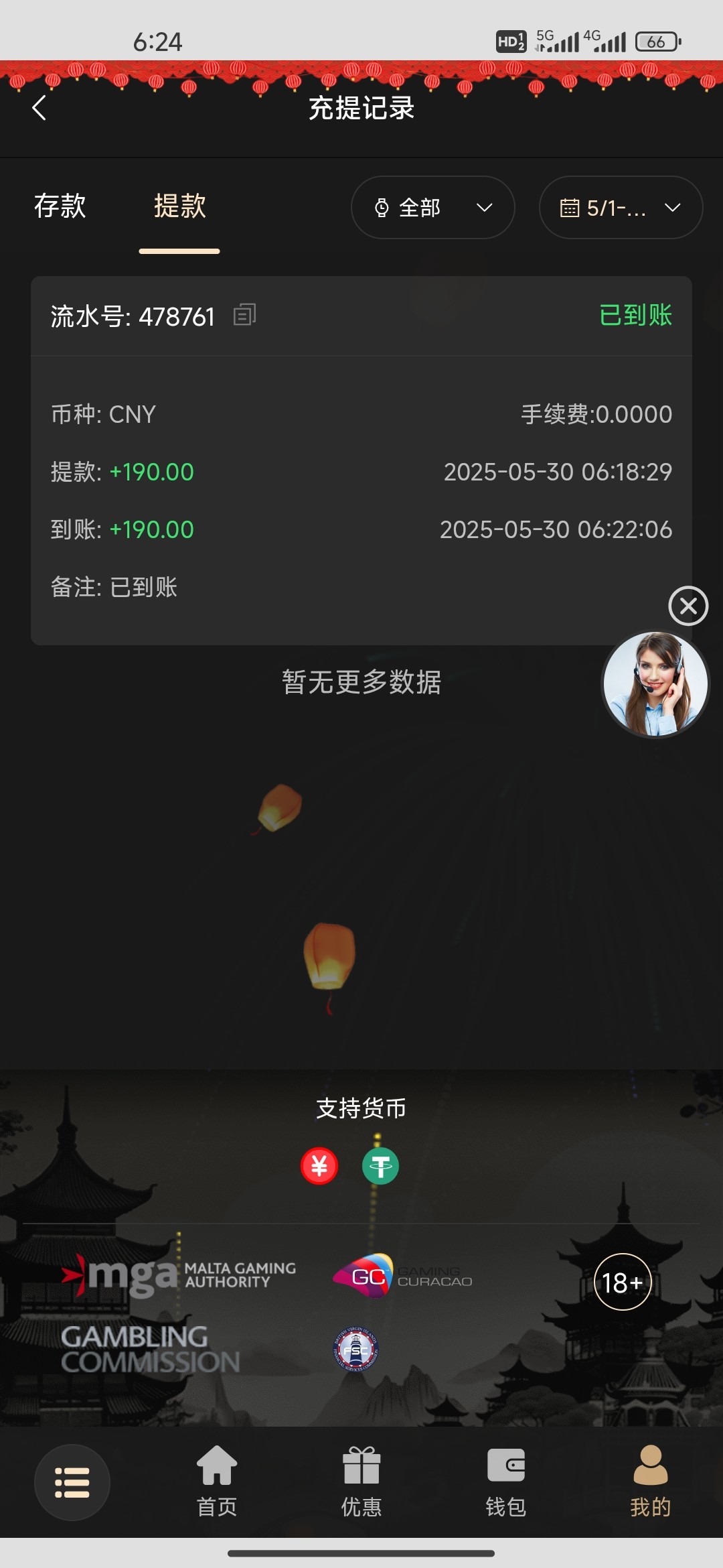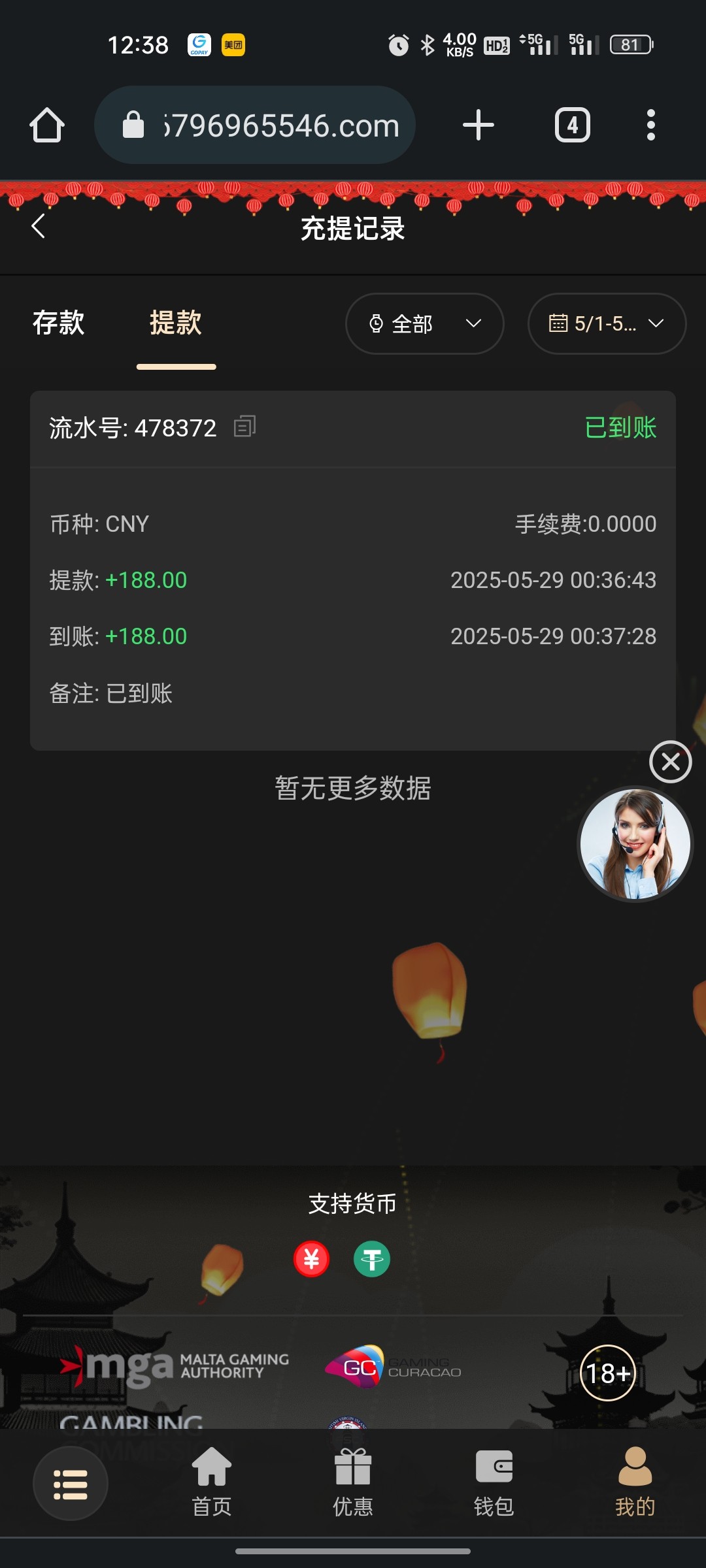 200+188 出500 直接买2块的福运买到1k刷完水剩500 提现有点慢