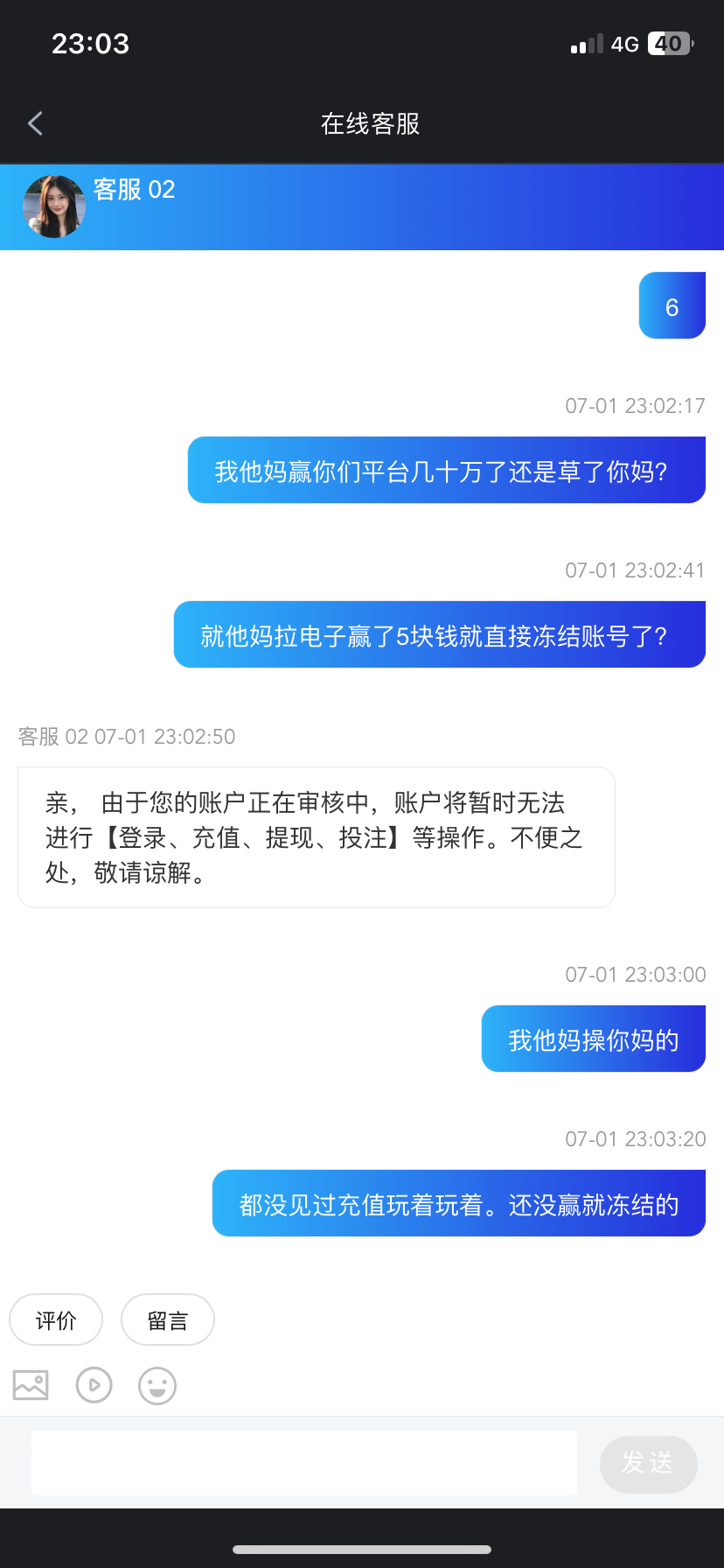 充值玩。刚充没10分钟 拉了几下就直接弹出来账号退出登陆 登陆上去就冻结了 真他妈傻逼台