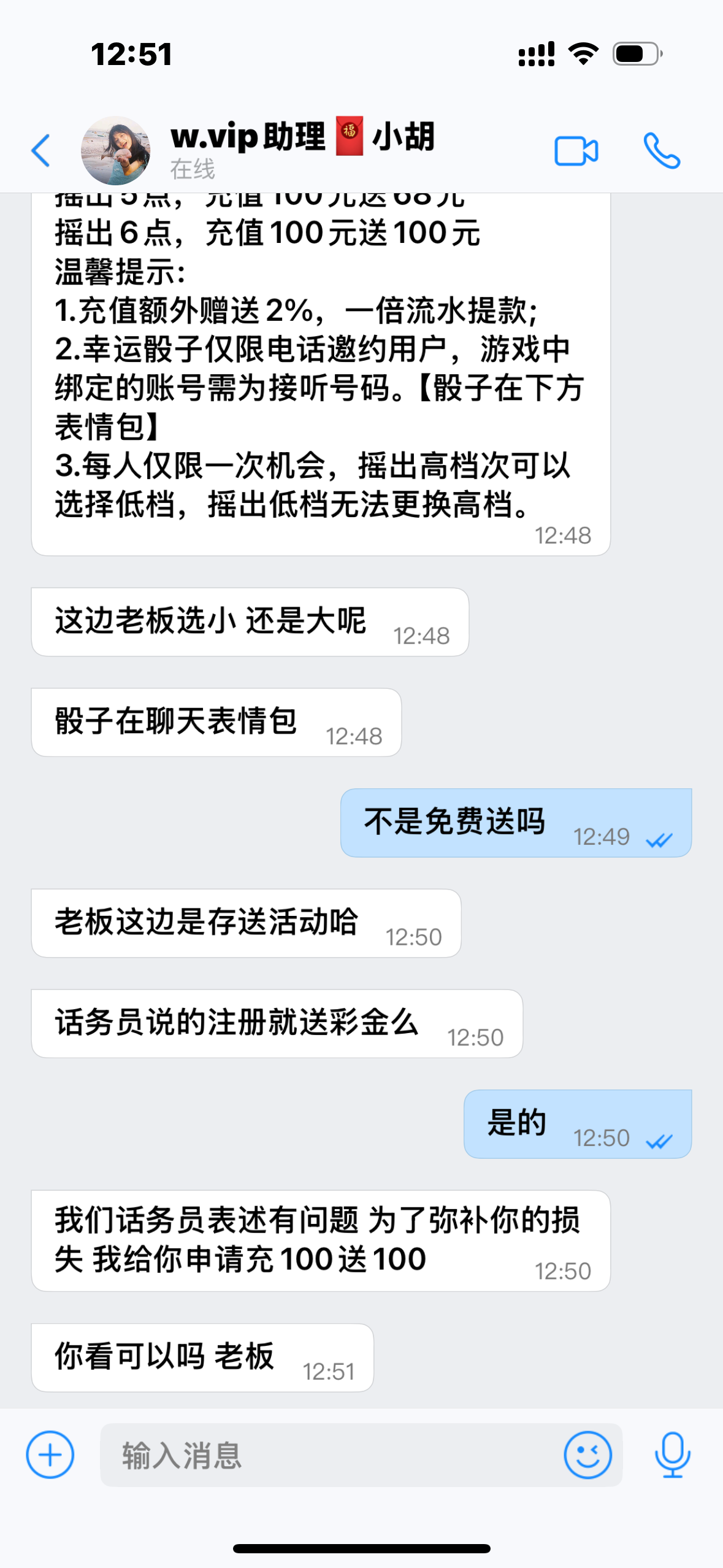 我之前也是这样说的充了100输完后面送我100我打个流水直接提 然后一直都没有玩了感觉会黑 他平台的麻将有点假不敢玩