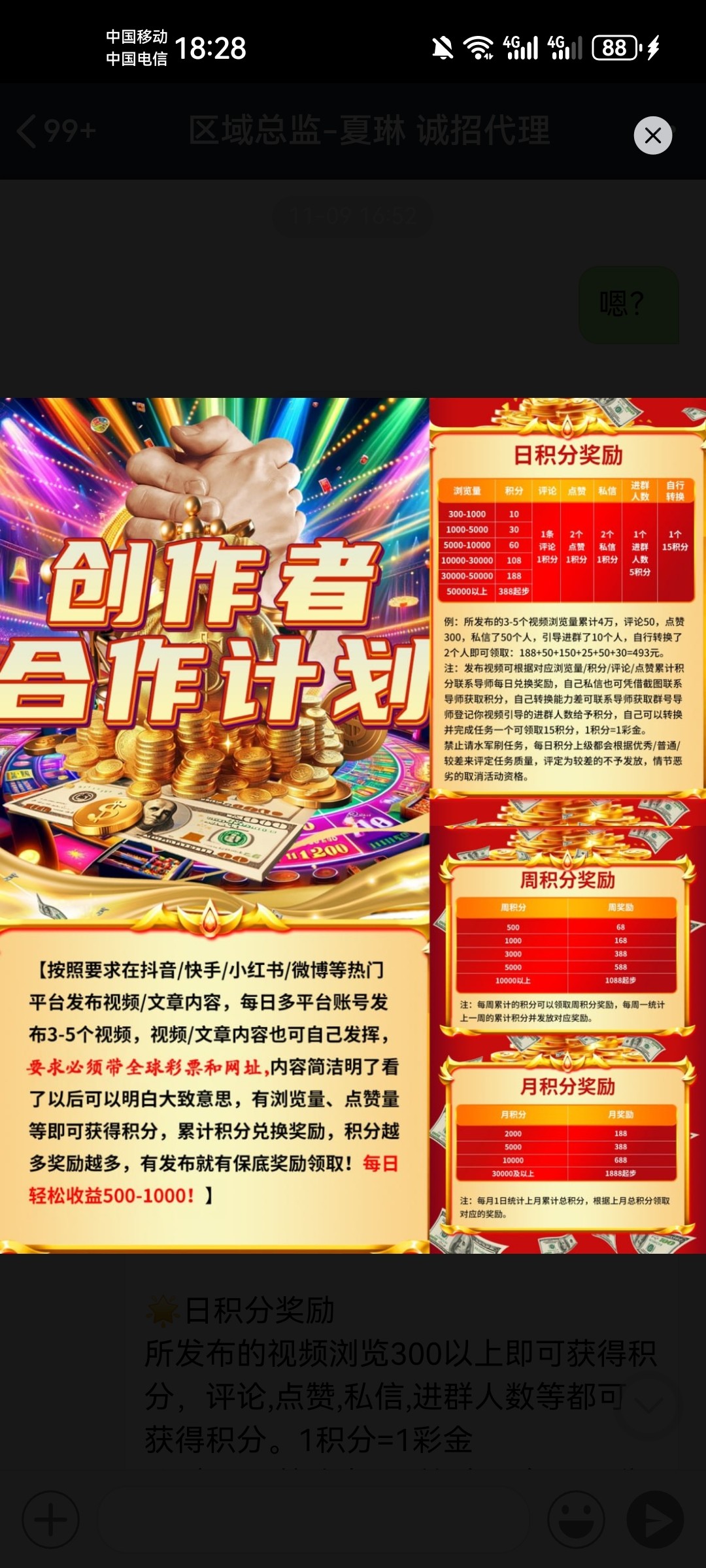 然后还有个发社交平台的彩金,一积分就是一块钱,会p图的可以去试试,最高388一天,一周还有奖励