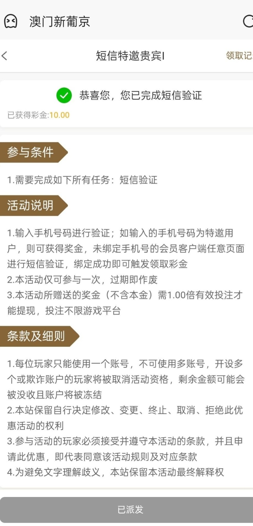 前几天注册过不是特邀,短信有这个台进去自助那里自动领取25667.my