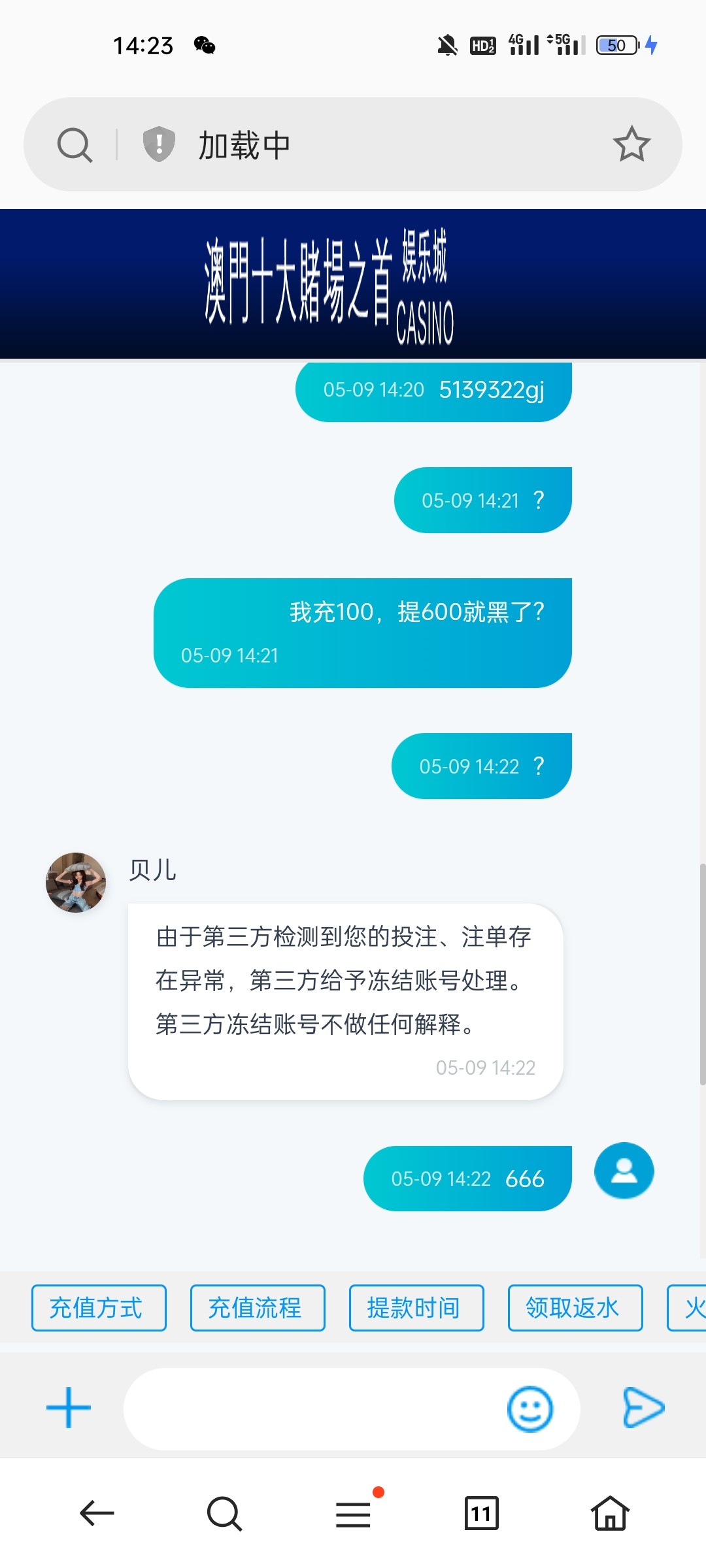 注意避雷,老哥们,玩了半年了陆陆续续的存了几千了,充值100玩飞禽走兽,压了50老鹰中了600,提现秒封号了,我日她奶奶的